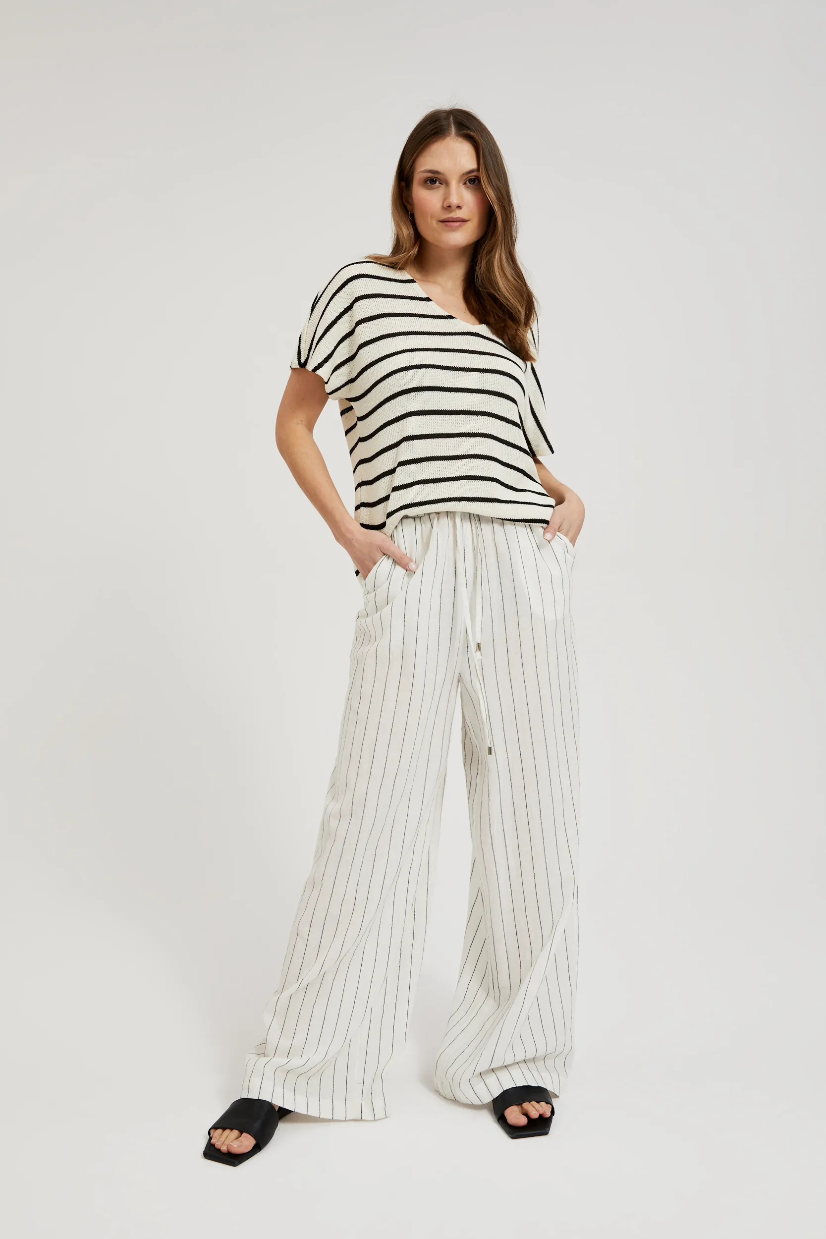 В колекції MOODO весна-літо 2024 є широкий асортимент моделей з додаванням льону: жакети, штани, сукні, блузки, шорти, сорочки, спідниці. Є моделі у яких льон поєднується з бавовною або віскозою, тому він більш м'який і приємний до тіла.